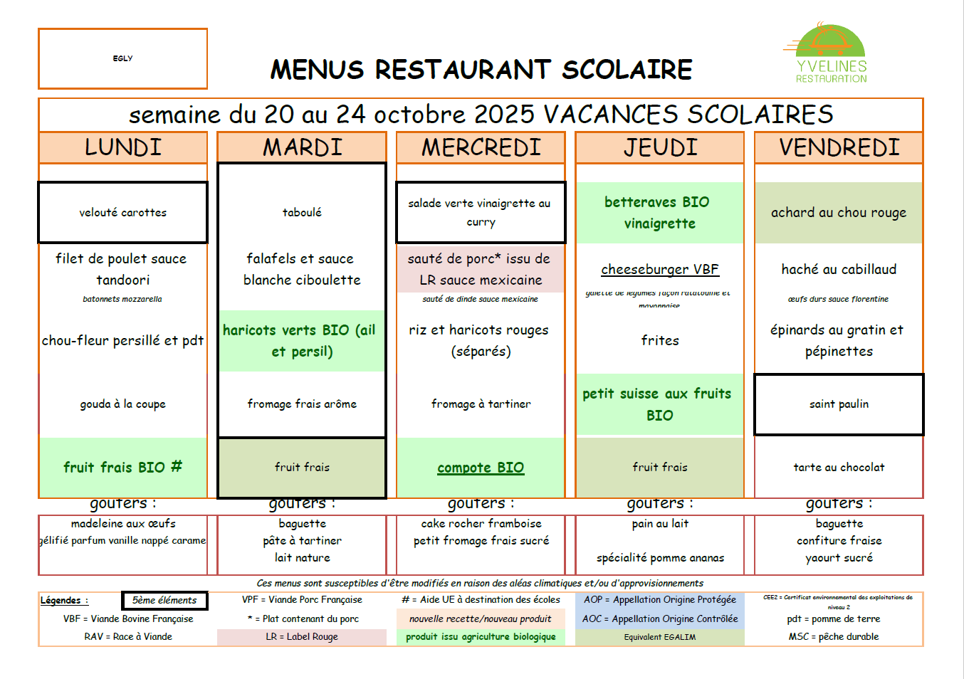 La société YVELINES RESTAURATION fournit les repas et goûters pour les Restaurants Scolaires et l'Accueil de Loisirs.