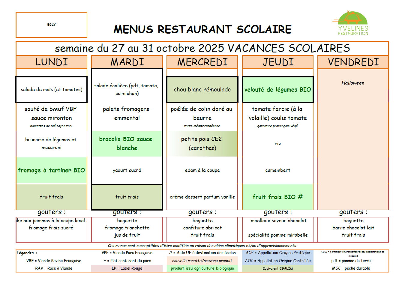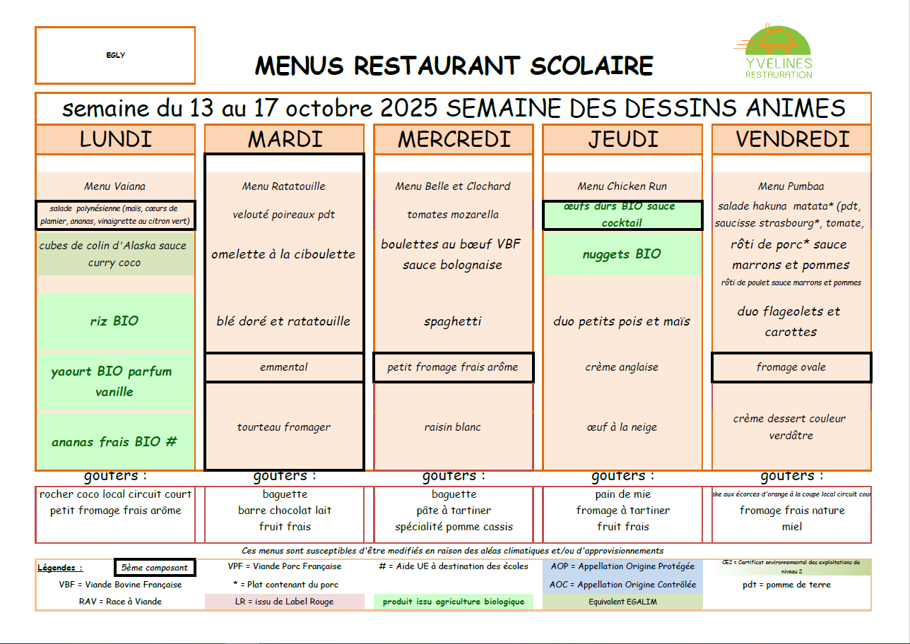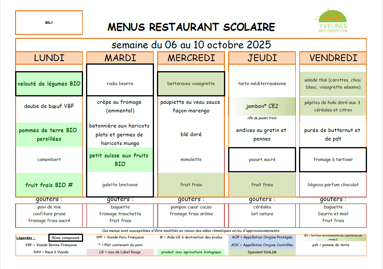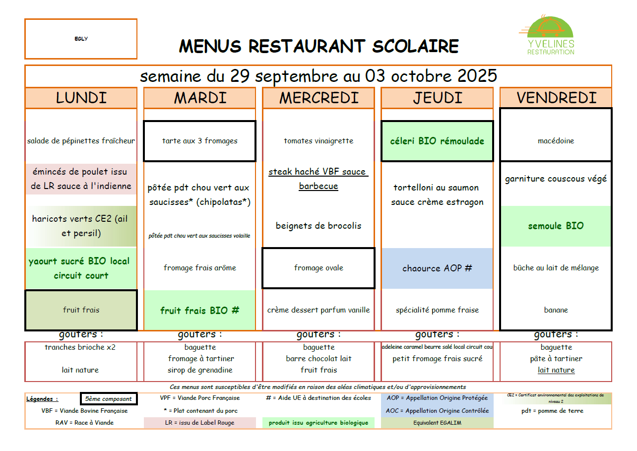 La société YVELINES RESTAURATION fournit les repas et goûters pour les Restaurants Scolaires et l'Accueil de Loisirs.