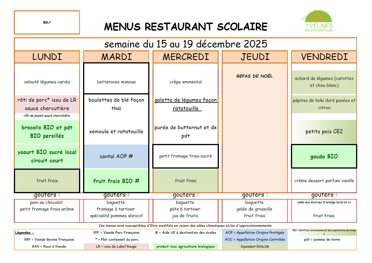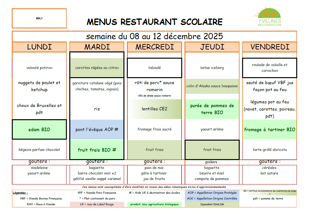 La société YVELINES RESTAURATION fournit les repas et goûters pour les Restaurants Scolaires et l'Accueil de Loisirs.